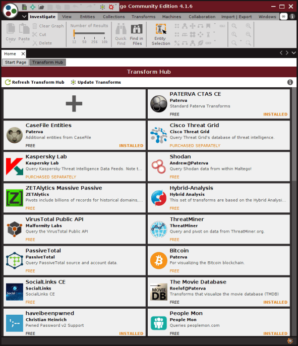 Here’s Maltego’s UI from my installation (On PCLinuxOS using the rpm packaged installation file), showing the default transforms, and a couple of useful free (As in free Beer) that I’ve found to be useful.